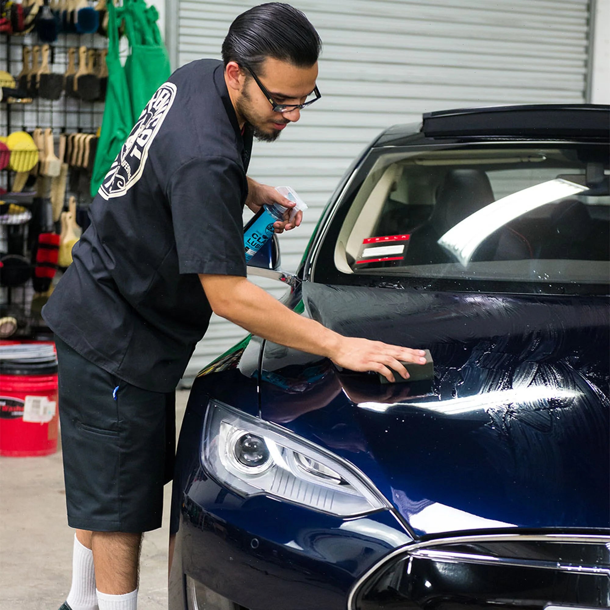 Wash entire vehicle, making sure the surface is clean and large particles are rinsed away. Spray a liberal amount of Clay Luber on the work area. Work in 2’ x 2’ areas at a time, and glide the clay substitute back and forth over the surface in straight lines until a smooth feel is achieved. Buff each completed section dry with a microfiber towel.