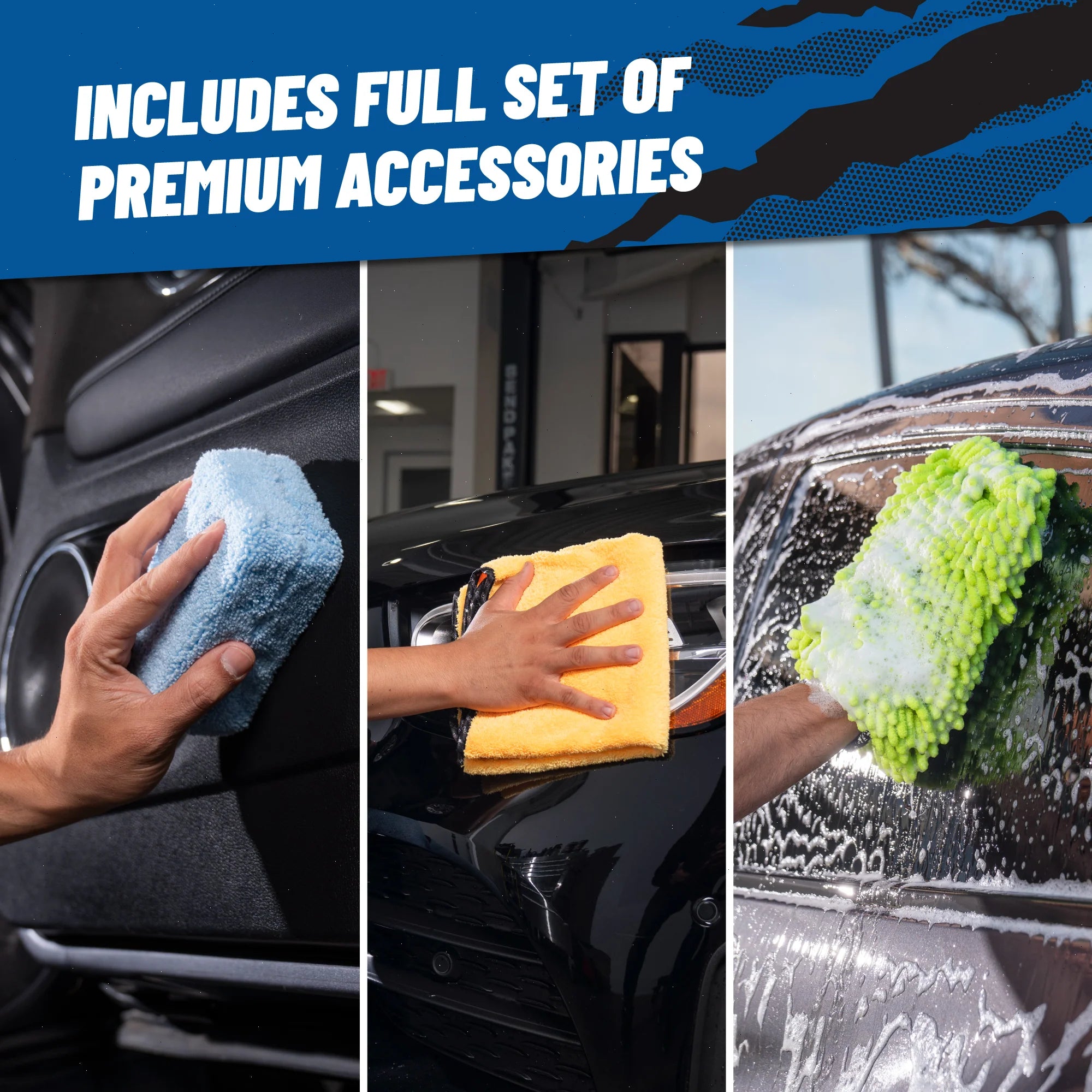 Score over $107 worth of premium Chemical Guys products in one complete kit. Wash and wax your ride, achieve streak-free glass, refresh your interior, and restore and protect trim and tires. Packed with a full set of premium accessories and finished with an exclusive collector’s gift box, this kit has everything you need to keep your car looking its best inside and out.