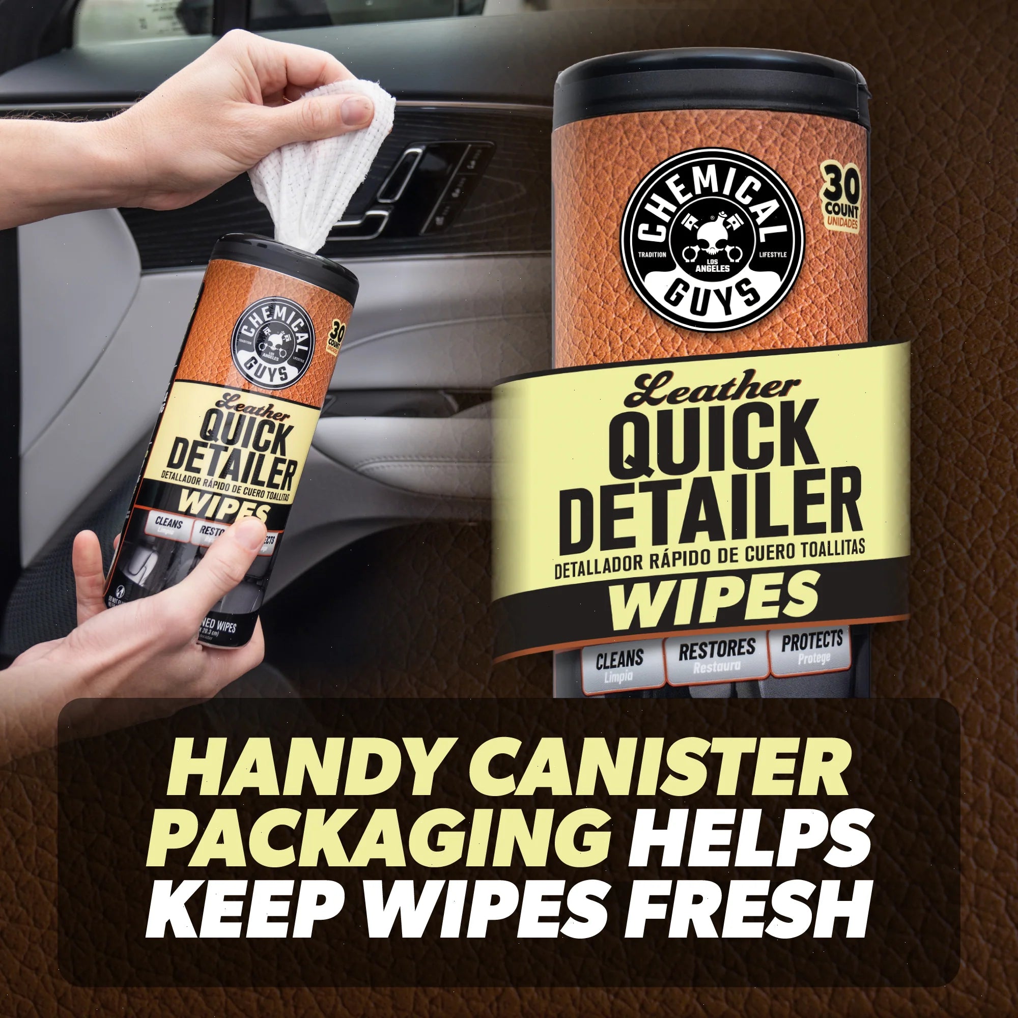 Enjoy three times the on-the-go leather detailing fun with this three-pack of ready-to-use, pre-moistened wipes that feature an advanced high-performance texture weave. Easily clean, restore, and protect various leather surfaces in your ride and elsewhere!